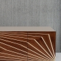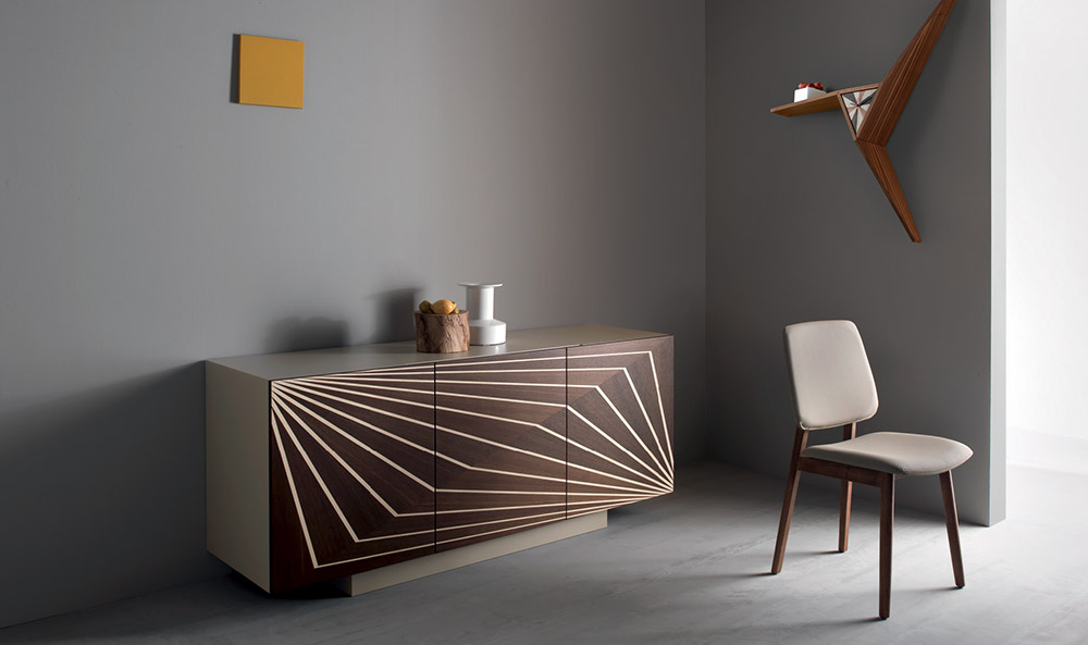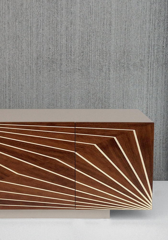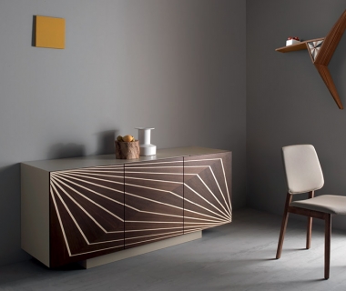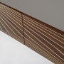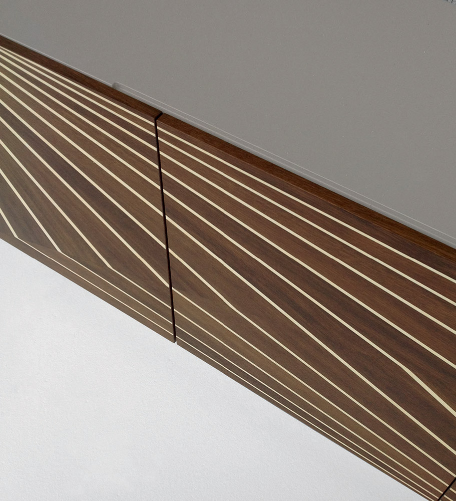 Cupboard with 3 doors in mat sand lacquered mdf. Three inner shelves in transparent safety glass 6mm. Doors in burned oak or walnut veneered with maple inlays.