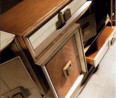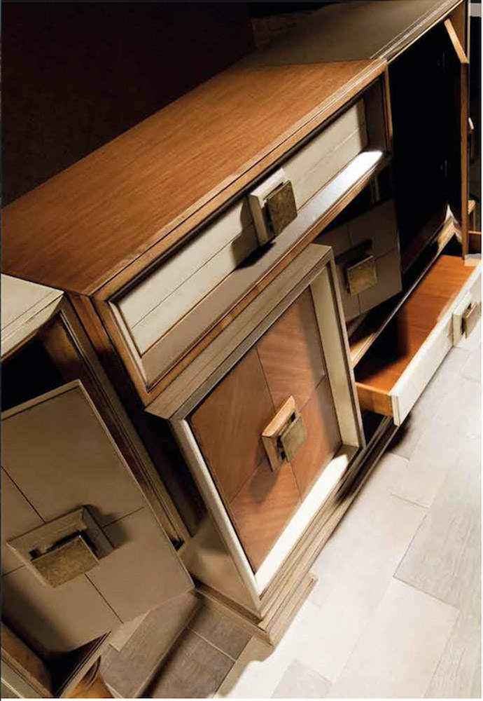 Our Dinastía asymmetric sideboard is a very original designer piece, because it conceals the spaces in each of its cases. It has a Zen style and at the same time, it flirts with a classic air by allowing a glimpse of wood grain its original colour, in some of its parts.